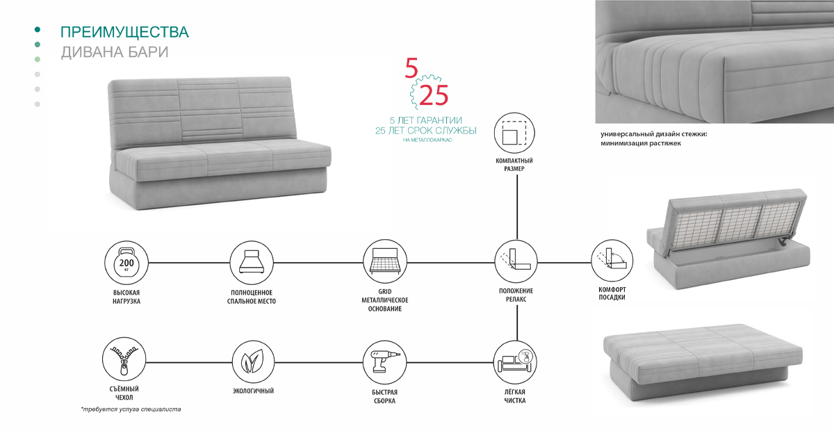 Диван Бари – практичный и лаконичный – создан дарить комфорт днём и ночью.