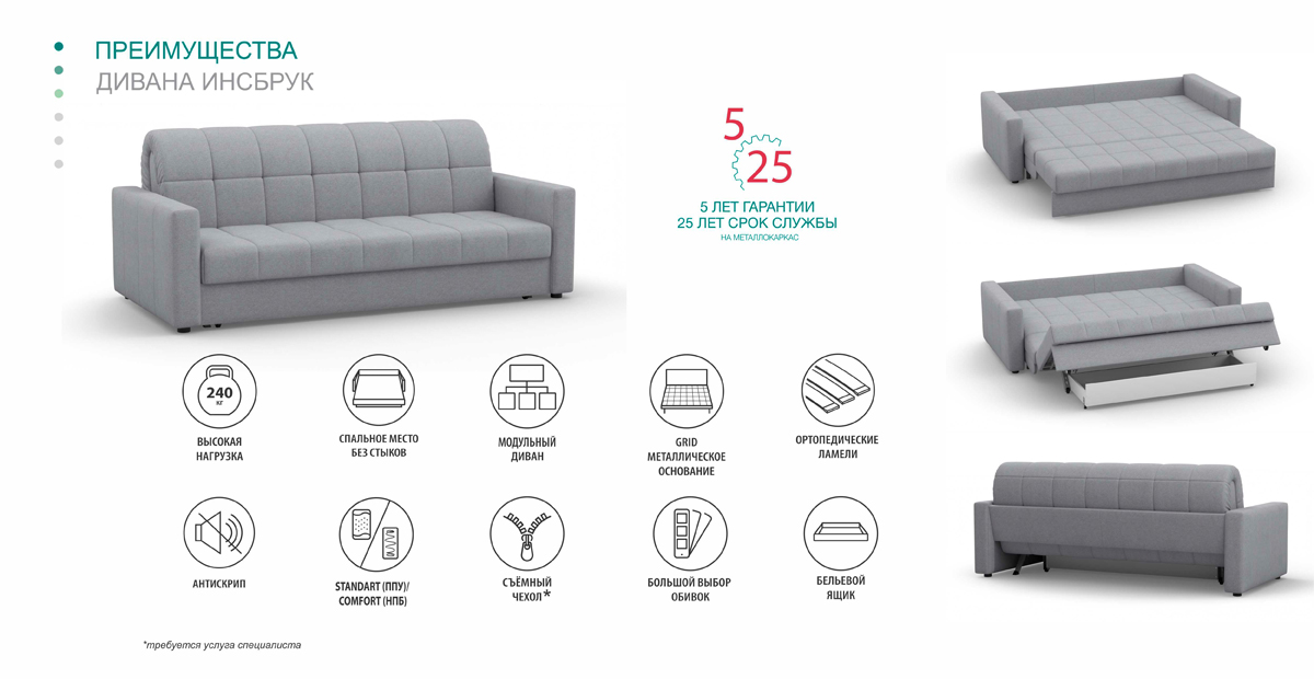 Диван Инсбрук с мягкими подлокотниками – невероятно комфортный. Конструкция матраса разделена на зоны сидения и сна. Механизм трансформации обеспечивает легкое складывание и раскладывание дивана с ровным спальным местом. Специальная система на механизме препятствует появлению скрипов в процессе эксплуатации дивана, что создает максимальный комфорт для самых требовательных покупателей. Эффективная система крепления надёжно удерживает чехол, фиксируя его равномерно по всему периметру. А стёжка на сиденье и спинке препятствует образованию складок, сохраняя красивый внешний вид дивана.