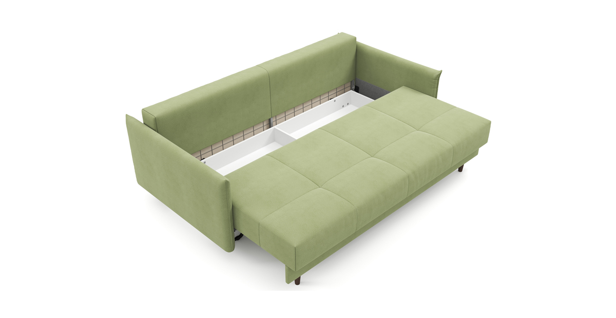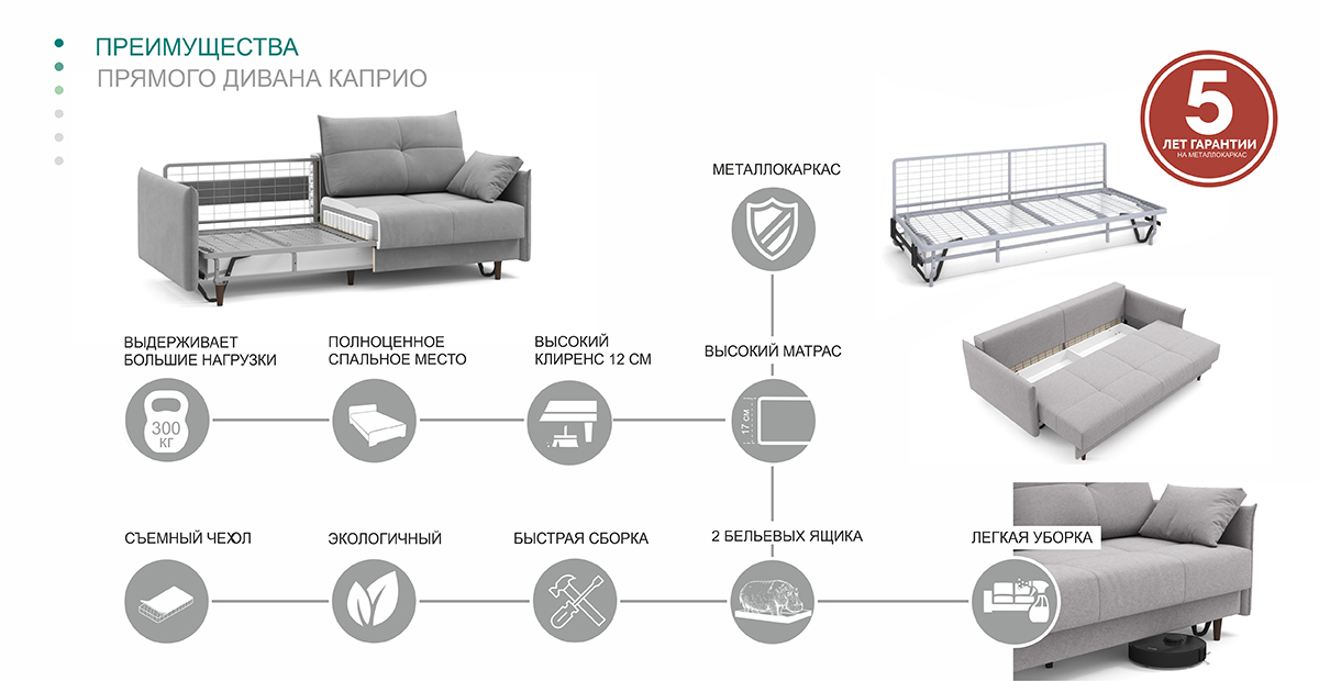 Несмотря на строгие формы, диван Каприо NEXT – это воплощение элегантности и уюта. Компактный и лаконичный, он идеально подойдет для небольшого помещения или для минималистичного интерьера, добавив ему нотки современного стиля. Узкие мягкие подлокотники – актуальный мебельный тренд. Английский шов на приспинных подушках и подлокотниках придаёт дивану оригинальность и ненавязчиво подчеркивает объём и мягкость наполнителя. Декоративная стёжка основной части сиденья и приспиных подушек препятствует растяжению ткани и сохраняет первоначальный красивый внешний вид дивана. Под сидением расположен вместительный бельевой ящик для хранения постельных принадлежностей. Благодаря высоким опорам с лёгкостью можно провести уборку самостоятельно или с помощью робота-пылесоса. Механизм трансформации дивана «Тик-Так» – надежный и долговечный – разработан для каждодневного сна. Материалы, из которых изготовлен Каприо, обеспечивают максимальную безопасность и комфорт эксплуатации в течение всего срока службы дивана. Металлические рамы, используемые в качестве элементов каркаса дивана, имеют высокую прочность, они не деформируются при больших нагрузках, не боятся перепадов температур и влажности. Матрас высотой 17 см с ортопедическим эффектом изготовлен из высокоэкологичных и гипоаллергенных материалов – пенополиуретана самого высокого качества. В основе матраса – независимый пружинный блок «Smartika».