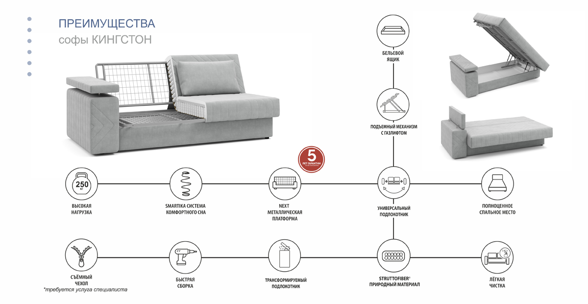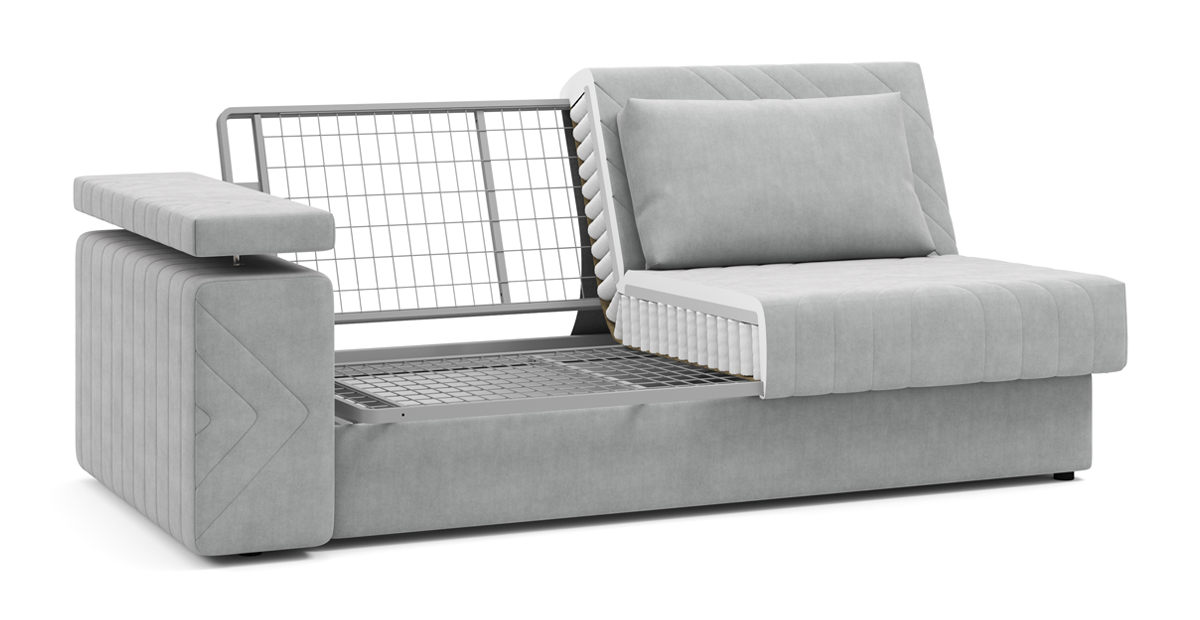 Кингстон NEXT – уютный и лаконичный современный диван. Актуальный дизайн со стильной стёжкой без подлокотников станет практичным украшением интерьера. Небанальная геометричная дизайнерская стёжка была разработана специально для этой модели, она подчеркивает необычные формы дивана, подчёркивая его динамичный и современный образ. Продуманная эргономика сидения и спинки, дополненная упругими приспинными подушками, делает Кингстон очень комфортным для отдыха. Уникальный механизм трансформации Матрикс позволяет легко раскладывать диван в двуспальную кровать одной рукой. И в любом положении его можно поднять на газлифтах для доступа к вместительному ящику. Прочность дивана обеспечивает металлический каркас. За комфорт во время отдыха и сна отвечает высокий современный матрас на базе независимого пружинного блока Smartika с инновационным материалом STRUTTOFIBER.