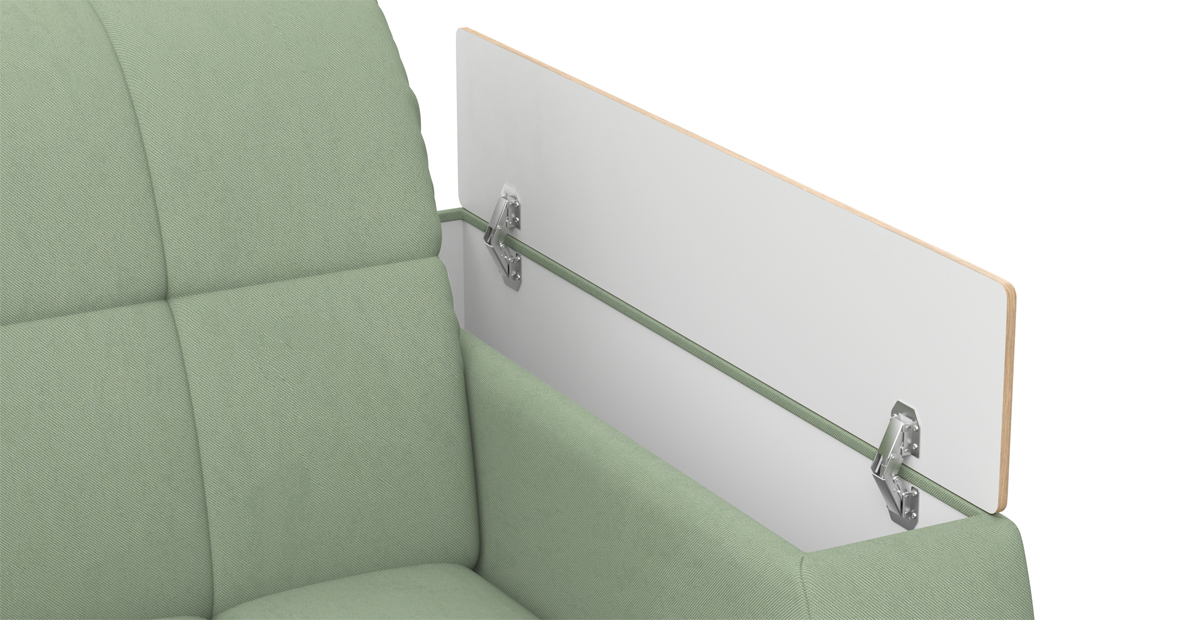Особенностью диванов с механизмом Аккордеон является просторное и ровное спальное место, несмотря на компактные размеры дивана в собранном положении. А также возможность встроить вместительный бельевой ящик. В данном механизме исключается возникновение скрипа благодаря сиденью дивана, которое выполнено на металлической сетке. Каждая из трех секций спального места имеет по 4 твердые точки опоры, которые исключают вероятность скрипа. Уникальная конструкция позволяет фиксировать сиденье почти в вертикальном положении, что обеспечивает самый комфортный доступ к бельевому ящику.