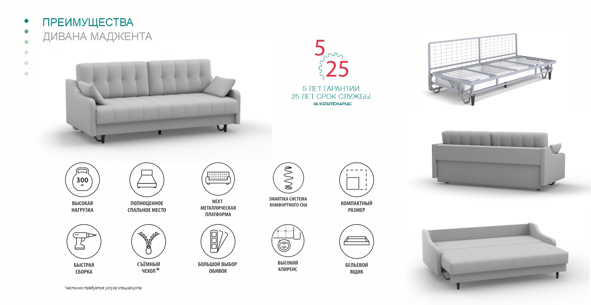 Невероятно лёгкий механизм трансформации превратит диван в полноценную кровать минимальными усилиями, справится даже ребёнок! Шагающий принцип раскладывания не испортит напольное покрытие.