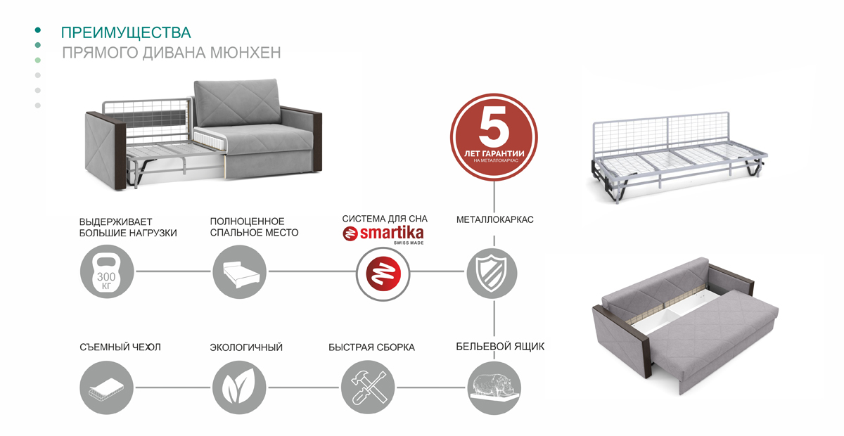 Диван "Мюнхен" очень мягкий и удобный. Раскладывается легко, одной рукой. Нам это было важно, чтобы ребенок сам мог его раскладывать. Но если нужно просто отдохнуть днём, то достаточно убрать подушки. Площадь сидения в сложенном виде достаточная. Это удобно, так как площадь комнаты небольшая - 9м2. Мы очень довольны.