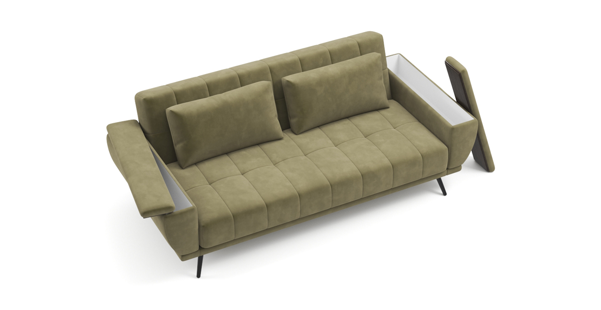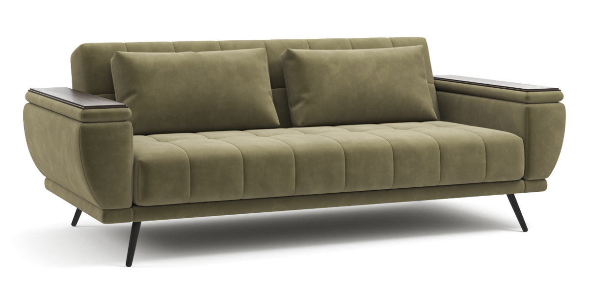 Стильный диван Шербрук NEXT на высоких ножках сочетает в себе современные тенденции и комфорт. Привлекательный дизайн с плавными и округлыми линиями подойдёт любому интерьеру. Необычные подлокотники придают дивану изюминку не только во внешнем виде, но и в практичности. Две ниши в них заменяют традиционный ящик для белья. Верхняя часть каждого из них снимается и ставится любой стороной вверх, превращаясь из мягкого варианта в подлокотник с декором цвета «венге» и обратно по желанию. Инновационный наполнитель Skyfiber сохраняет форму и комфортную упругость приспинных подушек. Механизм трансформации позволяет поставить диван вплотную к стене и легко превращает его в удобное спальное место без стыков. Матрас 21 см высотой с независимым пружинным блоком Smartika Pro выдерживает большую нагрузку (до 240 кг), эффективно распределяя её. Единая металлическая конструкция основания спинки и механизма трансформации – надёжный и долговечный каркас NEXT. Он легко выдерживает ежедневную активную эксплуатацию. Благодаря обивке задней спинки, диван можно применять для зонирования пространства. За ним легко ухаживать: чехол приспинных подушек съёмный, на молнии.