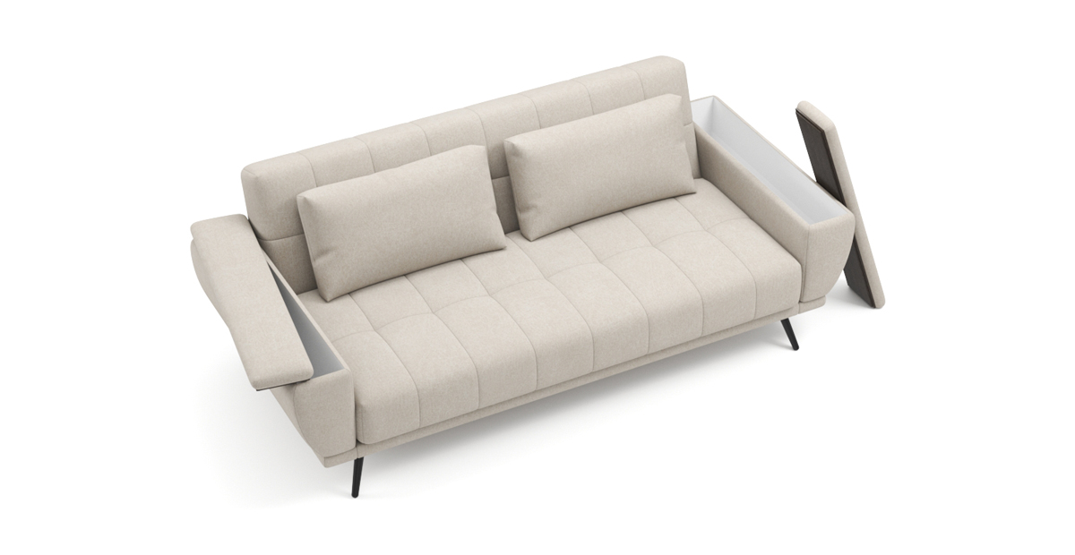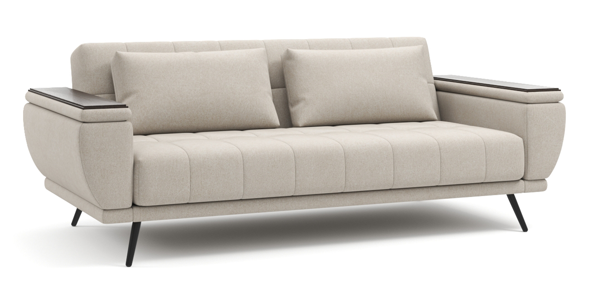 Стильный диван Шербрук NEXT на высоких ножках сочетает в себе современные тенденции и комфорт. Привлекательный дизайн с плавными и округлыми линиями подойдёт любому интерьеру. Необычные подлокотники придают дивану изюминку не только во внешнем виде, но и в практичности. Две ниши в них заменяют традиционный ящик для белья. Верхняя часть каждого из них снимается и ставится любой стороной вверх, превращаясь из мягкого варианта в подлокотник с декором цвета «венге» и обратно по желанию. Инновационный наполнитель Skyfiber сохраняет форму и комфортную упругость приспинных подушек. Механизм трансформации позволяет поставить диван вплотную к стене и легко превращает его в удобное спальное место без стыков. Матрас 21 см высотой с независимым пружинным блоком Smartika Pro выдерживает большую нагрузку (до 240 кг), эффективно распределяя её. Единая металлическая конструкция основания спинки и механизма трансформации – надёжный и долговечный каркас NEXT. Он легко выдерживает ежедневную активную эксплуатацию. Благодаря обивке задней спинки, диван можно применять для зонирования пространства. За ним легко ухаживать: чехол приспинных подушек съёмный, на молнии.