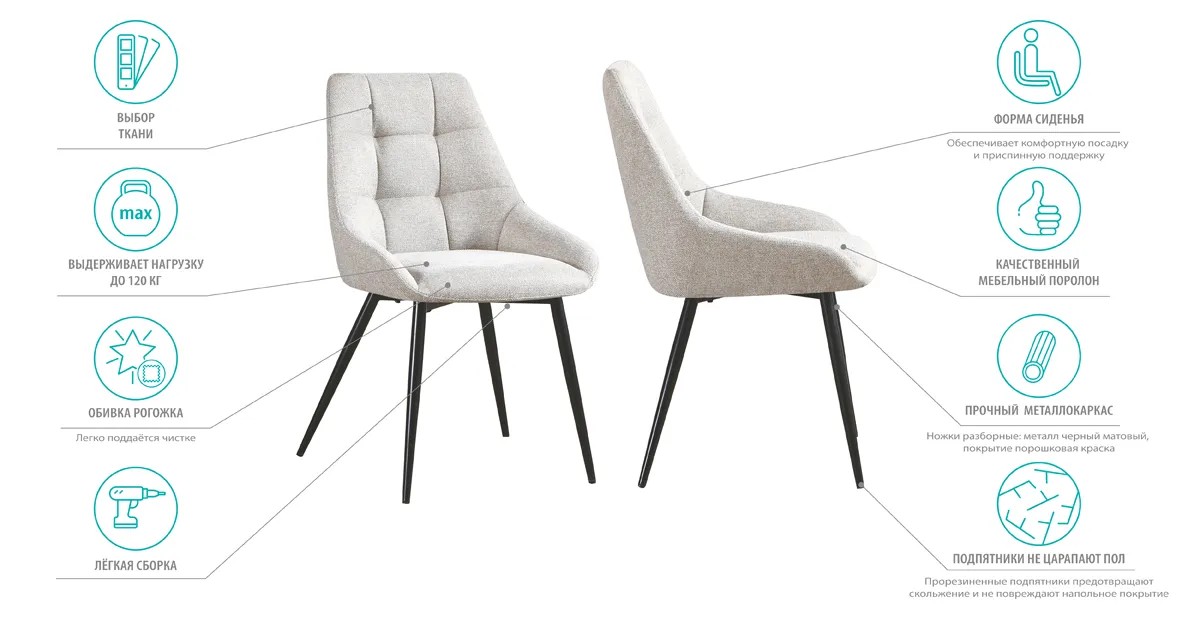 Такой лаконичный дизайн подходит для домашнего интерьера, для стильных обеденных зон и современных кухонь. Он будет уместен в кафе, ресторане, офисе или другом общественном пространстве. Стильная классическая стёжка удерживает ткань от деформации и растягивания и делает образ стула привлекательным. Мягкое сиденье приятное на ощупь. Материал гипоаллергенный и экологичный, прочный, эластичный и износостойкий. Эргономичная форма обеспечивают удобную посадку. Надёжные металлические опоры устойчивы к внешним воздействиям и коррозии. Форма ножек добавляет внешнему виду стула оригинальности. Специальные подпятники защищают напольное покрытие от царапин и делают каркас устойчивее. Выдерживает статическую нагрузку до 120 кг.