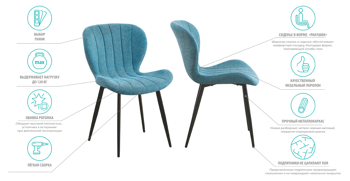Надёжные металлические опоры устойчивы к внешним воздействиям и коррозии. Форма ножек добавляет внешнему виду стула оригинальности. Специальные подпятники защищают напольное покрытие от царапин и делают каркас устойчивее.