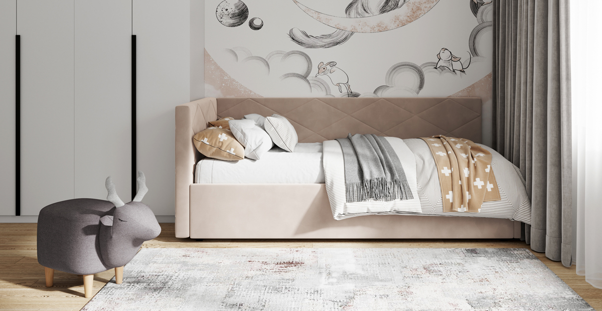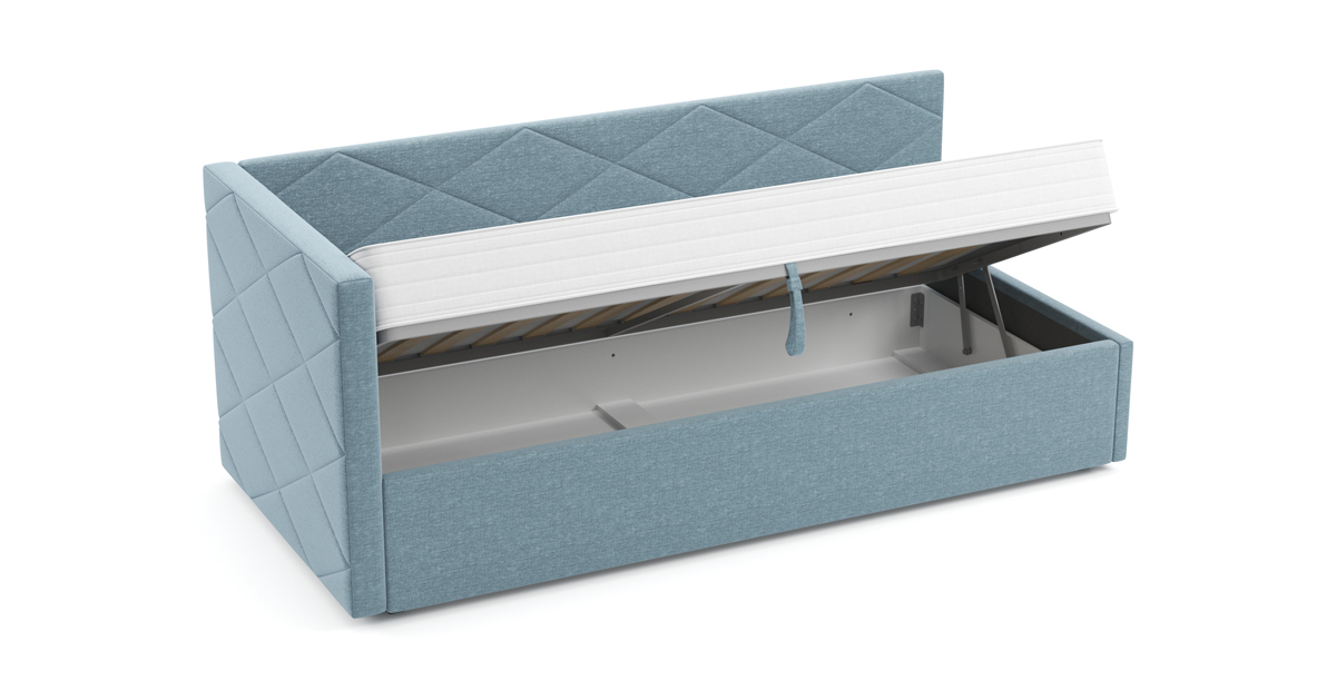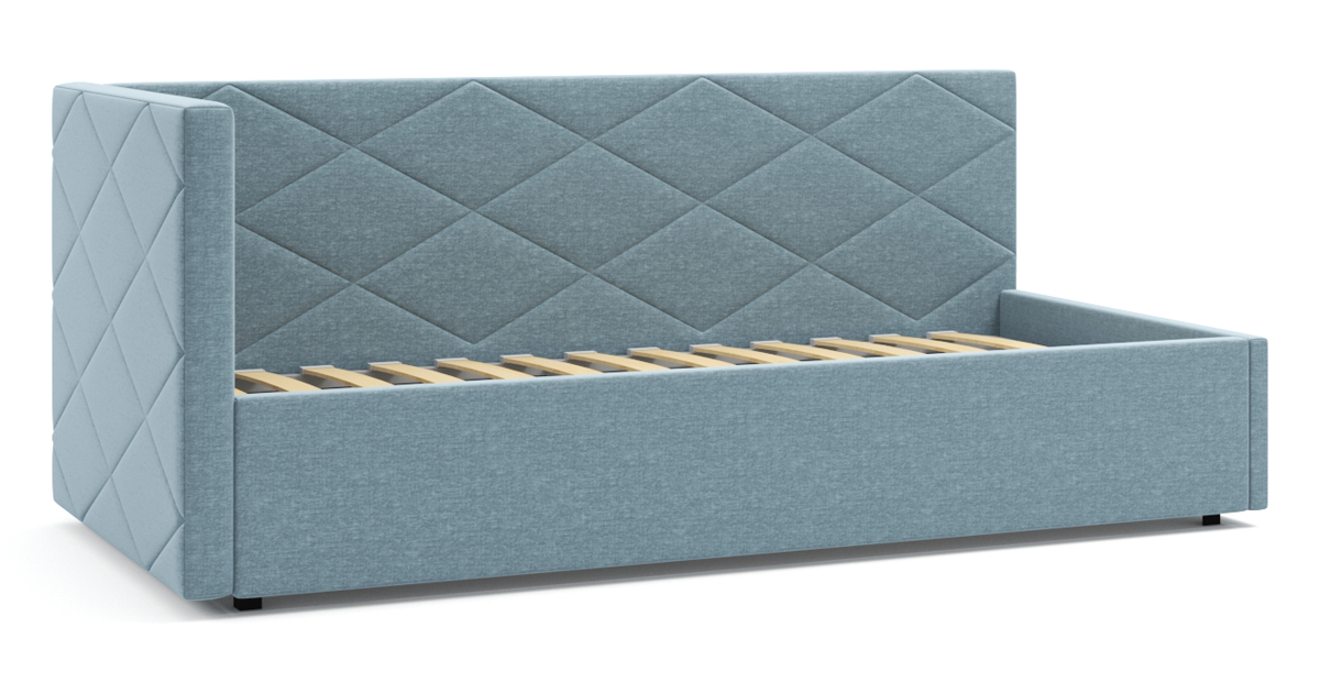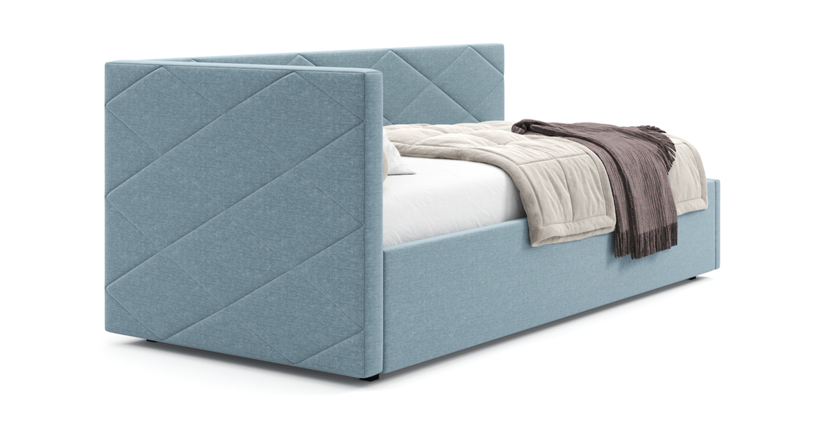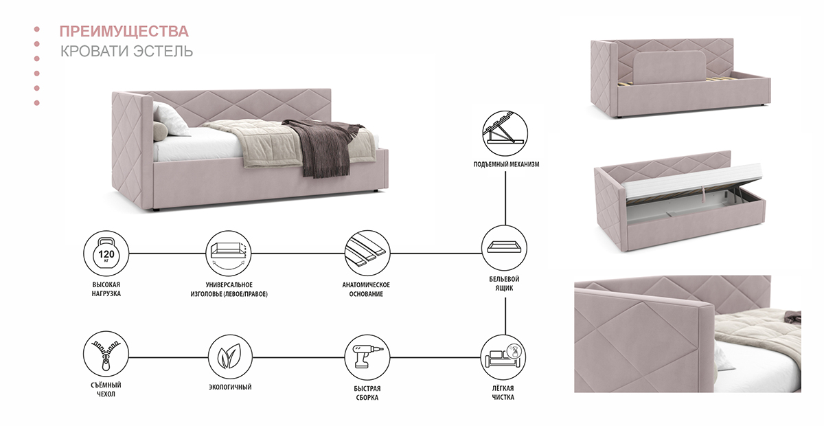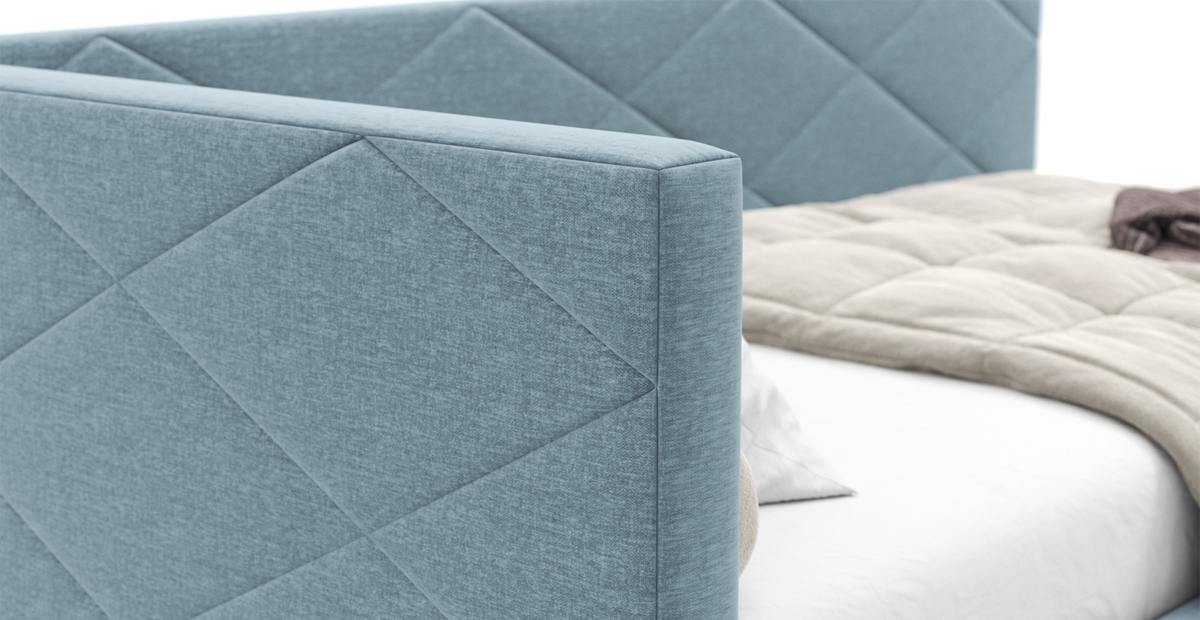 Кровать Эстель с высокими мягкими изголовьем и спинкой – это уютное спальное место. Декоративная геометрическая стёжка на спинке и изголовье – стильная и универсальная – идеально подойдёт к любому интерьеру. Основание с металлической рамой – залог прочности и долговечности кровати. Благодаря накладным латодержателям матрас не касается металла и прекрасно вентилируется. Вместительный бельевой ящик усилен металлическими уголками. А металлические футорки в местах соединения элементов кровати позволяют многократно её разбирать и собирать, каждый раз сохраняя их надёжную фиксацию. Съёмный чехол на царге и спинке облегчает уход за кроватью.