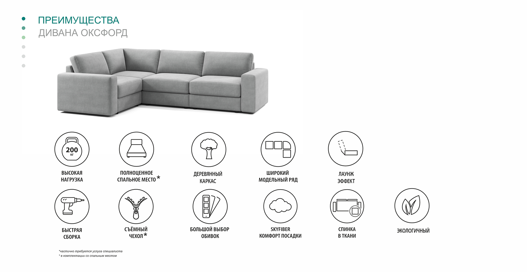 Стильный угловой диван Оксфорд – солидный и роскошный даже в таких компактных размерах. Задняя спинка выполнена из основной ткани, поэтому Оксфорду всегда найдётся место, он идеален для разделения пространства.