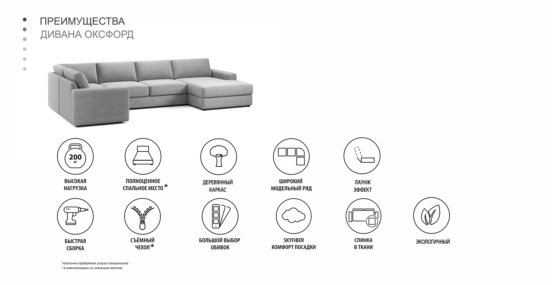Стильный П-образный диван Оксфорд – солидный и роскошный. Задняя спинка выполнена из основной ткани, поэтому Оксфорду всегда найдётся место, он идеален для разделения пространства. А кубические формы и плавные линии – отражение современных тенденций на службе комфорта. Высокий матрас с независимым пружинным блоком и инновационный наполнитель приспинных подушек обеспечивают комфортную упругость и надолго сохраняют его форму. В сочетании с глубокой посадкой и углом наклона подушек получился очень удобный диван.